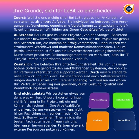 Zuerst: Weil Sie uns wichtig sind! Bei LeBit gibt es nur A-Kunden. Wir